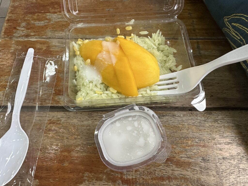休憩時間の軽食でいただいたマンゴースティッキーライス(もち米)です。