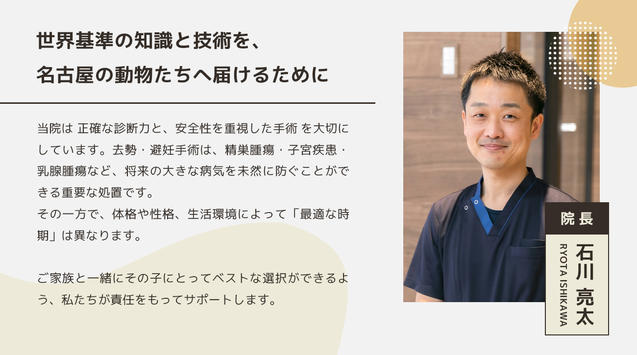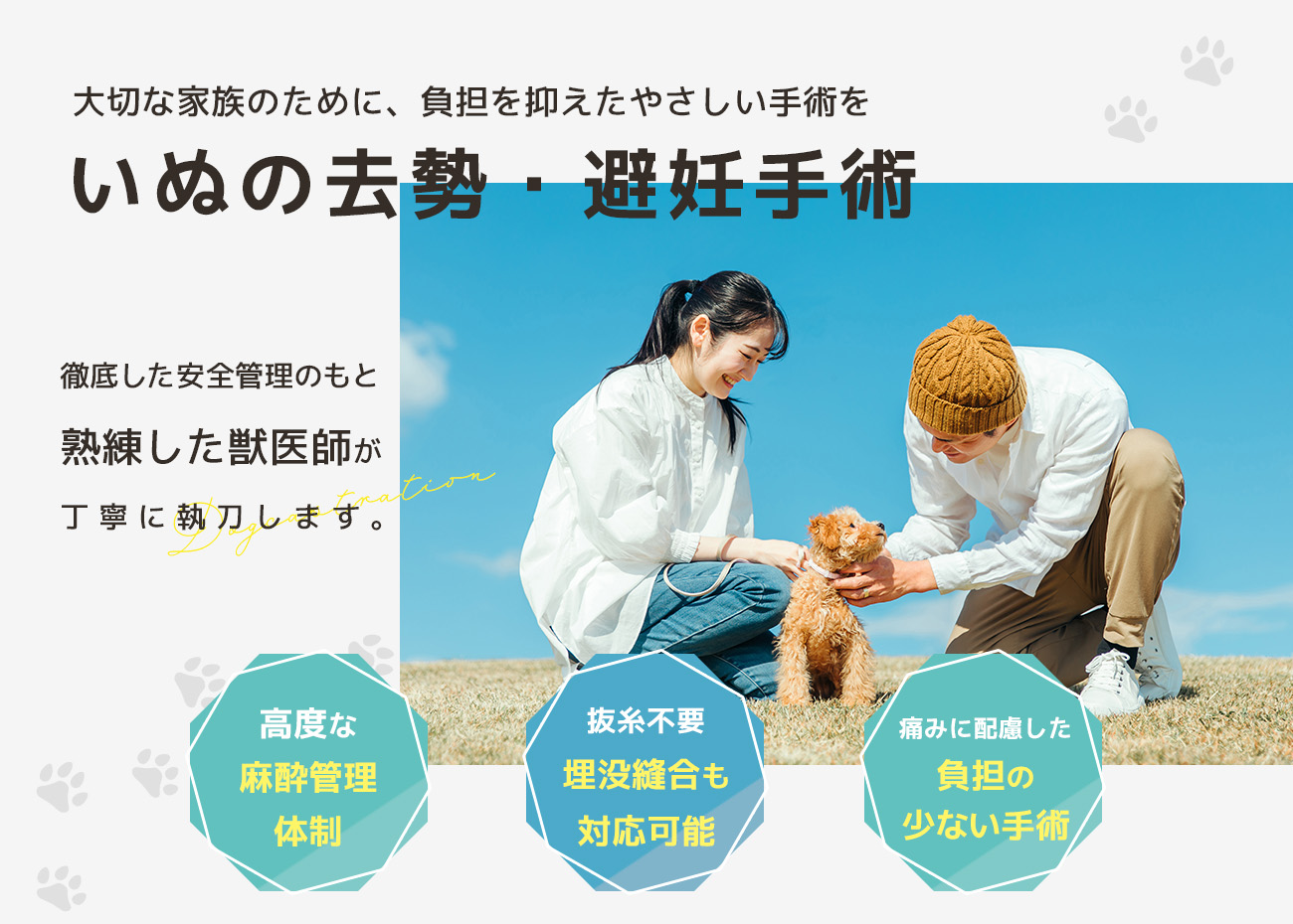 愛犬にとって、避妊去勢手術は一生に一度の大切な手術です。当院では一例一例に全力を持って取り組んでいます。ご心配のことがありましたら遠慮なくご相談ください!